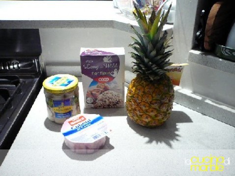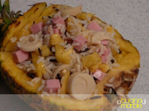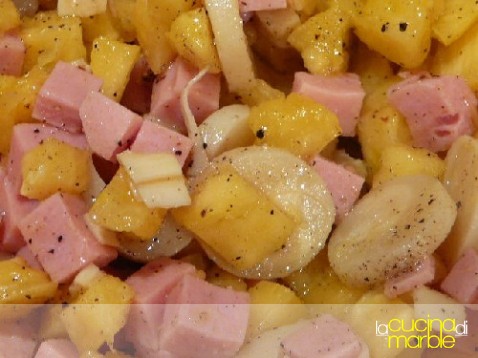 intanto tagliare a pezzetti la polpa di ananas, tagliare i cuori di palma, unire il prosciutto cotto